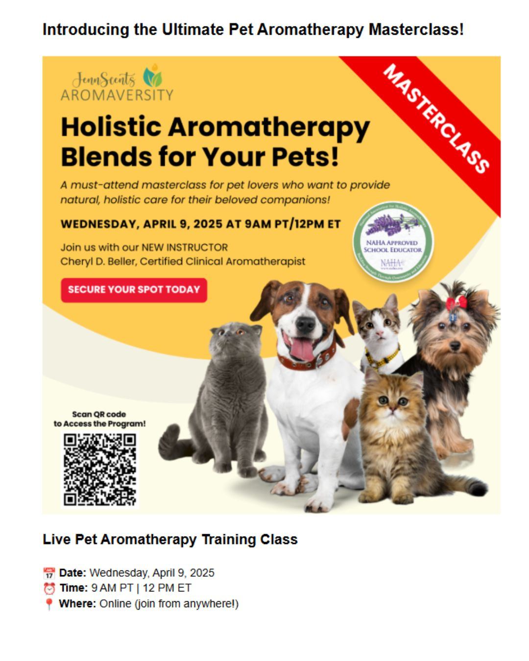 As an expert instructor for JennScents Aromaversity, Cheryl delivers her online class on aromatherapy for pets. JennScents Aromaversity is a NAHA (National Association for Holistic Aromatherapy) sanctioned school for aromatherapists at all levels. Her Master Class, "Create Holistic Aromatherapy Blends for Your Pets" is available above.